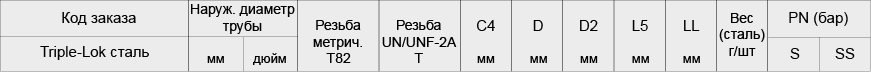 Детали Triple-Lok® из стали, нерж. стали и латуни поставляются с уплотнителем из NBR в стандартной комплектации. Более подробная информация о других материалах уплотнителя на стр. K92. Приведенные коды заказа включены в нашу текущую программу производства. Дюймовые и метрические детали могут различаться по размеру шестигранника.