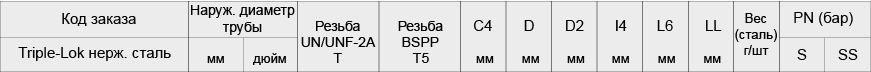 Детали Triple-Lok® из стали, нерж. стали и латуни поставляются с уплотнителем из NBR в стандартной комплектации. Более подробная информация о других материалах уплотнителя на стр. K92. Приведенные коды заказа включены в нашу текущую программу производства. Дюймовые и метрические детали могут различаться по размеру шестигранника.